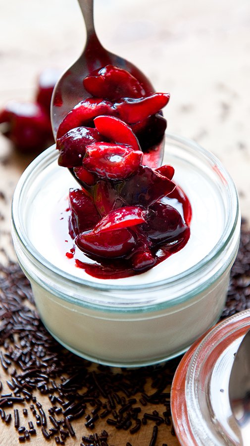 7. En un vaso, alternar capas gruesas del yogur helado con capas finas de salsa de cerezas y servir. ¡Buen provecho!