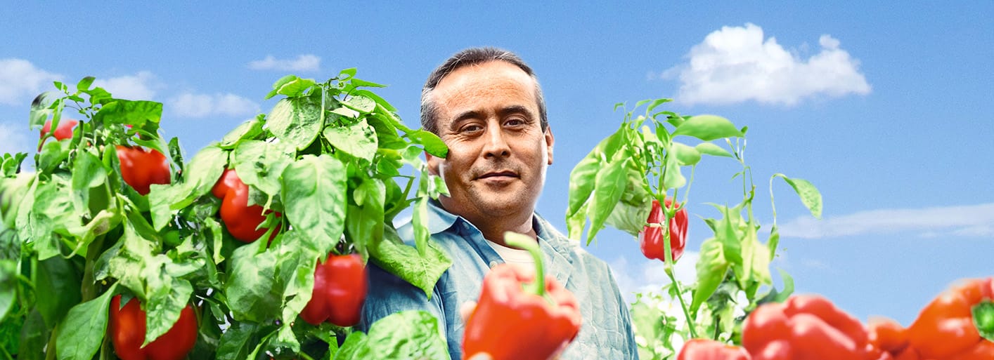 »Für mich gibt es einfach keinen besseren Pausensnack als unsere Paprika«, sagt Pflücker Toni und beißt mit Freude ab. »Sie sind so wunderbar knackig und saftig – du bekommst sofort gute Laune, wenn du in sie beißt.«