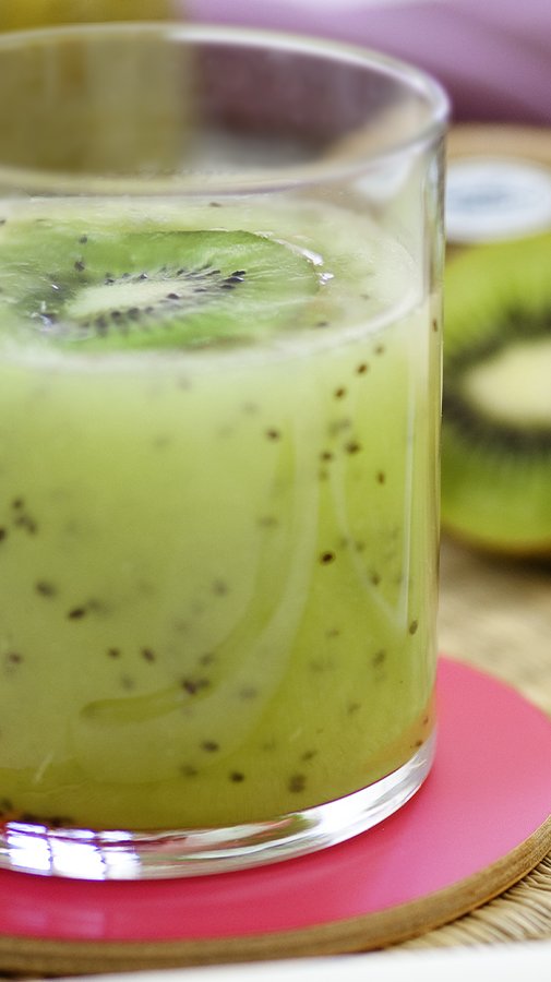 - Kiwis schälen und in Scheiben schneiden. Mit dem Stabmixer glatt pürieren.