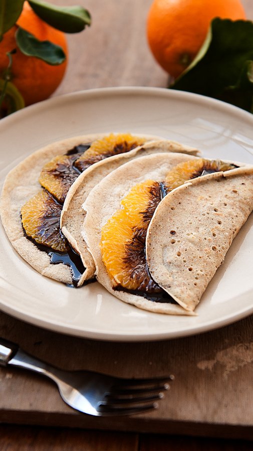 "Orange crêpes with chocolate sauce – a delightful citrus-infused dessert with a rich chocolate drizzle.