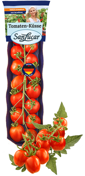 A plate of seared zander fish fillet served over a bed of tomato relish with roasted baby potatoes, drizzled with balsamic glaze. On the side are vine tomatoes and a bottle of Mazzetti CREMAceto balsamic cream along with SanLucar Tomaten-Küsse cherry tomatoes.