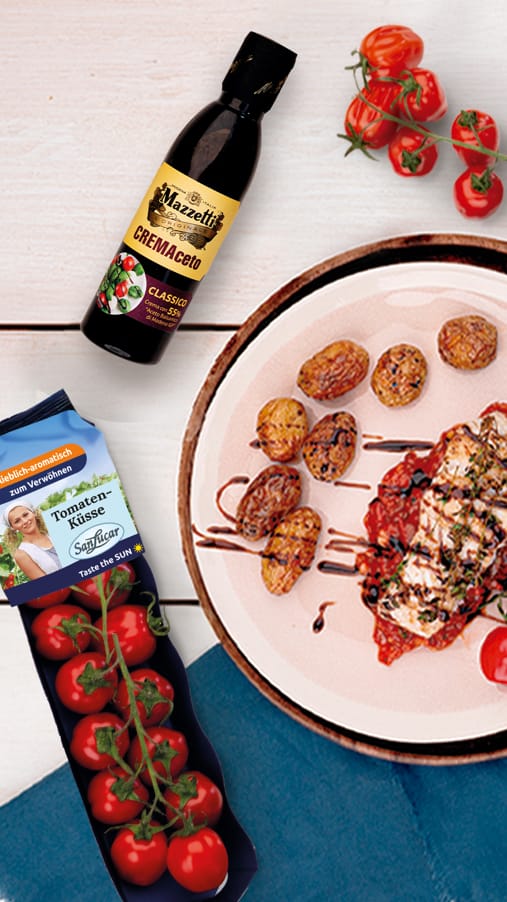 A plate of seared zander fish fillet served over a bed of tomato relish with roasted baby potatoes, drizzled with balsamic glaze. On the side are vine tomatoes and a bottle of Mazzetti CREMAceto balsamic cream along with SanLucar Tomaten-Küsse cherry tomatoes.